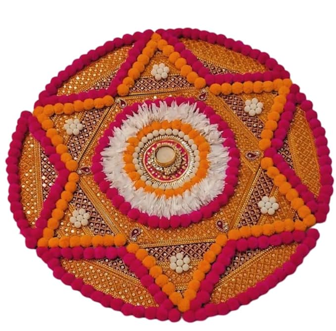 Get festive with our Handcrafted Gota Pati Work Decorative Rangoli Mat! Perfect for Diwali, Navratri, and weddings, this 60 cm diameter MDF mat is ready to use and adds a touch of traditional charm to any celebration. No need to stress about decorations with this colorful and intricately designed mat.